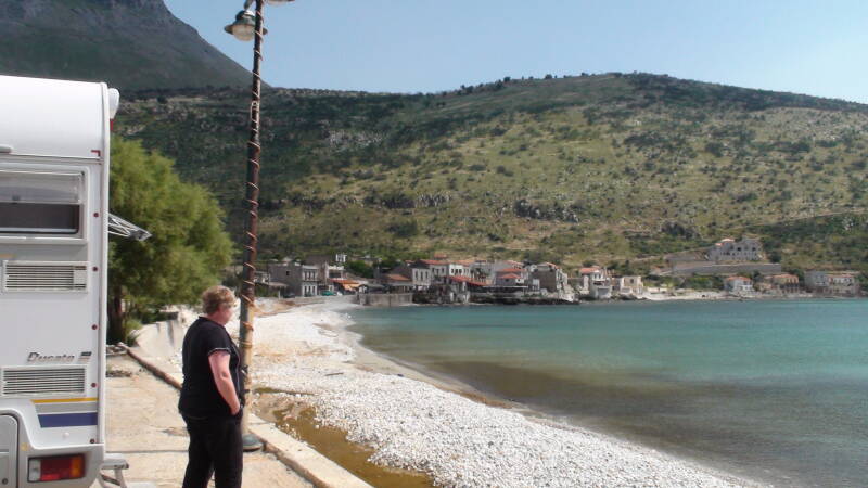 Op dit, middelste gedeelte van de Mani, moet je zeker naar het meest zuidelijke puntje rijden. Dit is wel het meest aparte gebied van Griekenland. Na deze spectaculaire rondrit zijn we naar Kotronas gereden. Hier kun je met de camper op de pier staan waar de vissers aanleggen om te lossen. Alweer een prachtige plaats direct in het dorp met een goed restaurant aan het eind van de pier. Ook hier kun je weer vis kopen bij de plaatselijke vissers.