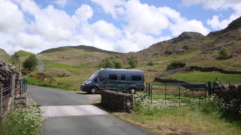 Vandaag gaan we naar de Hardknot Pass. Dus eerst naar Ambleside en vervolgens de B5343 naar de Wrynose Pass ( 25 % ), daarna komt de Hardknott Pass ( 30 % !). Voor mensen die deze passen willen rijden: de auto kan niet breder zijn dan 2.05 mtr., de overstek aan de achterkant mag niet groter dan een meter zijn, want anders blijf je in de bochten op je bumper hangen, dus deze passen zijn alleen te doen met een buscamper, of een personenauto. De chauffeur moet gewend zijn om te rijden op smalle en steile bergweggetjes, anders moet je dit niet doen! Deze weg is echt een belevenis, je kunt elkaar alleen maar tegenkomen op by-passes ( passeerhavens), maar je geniet van een prachtig landschap. Hierna naar Muncaster Castle gereden, maar