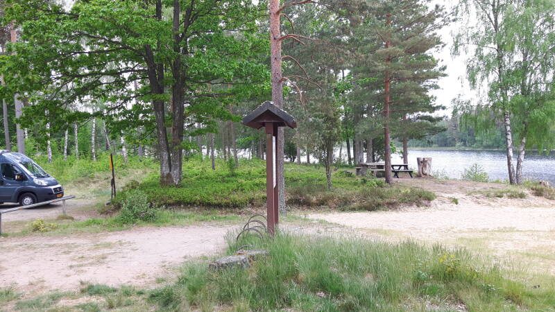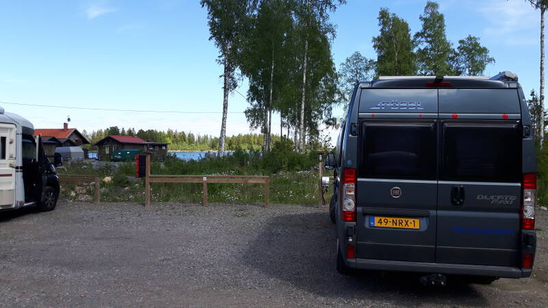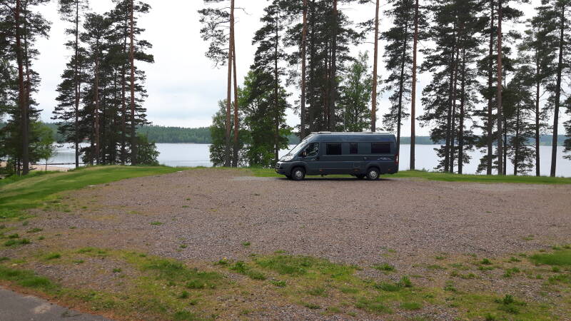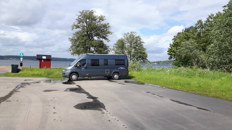 Vanmorgen lekker douchen en sani ritueel afwerken, inmiddels is het een beetje gaan motregenen dus we gaan verder. De rest van de dag in de regen gereden tot Sparreholm en daar op de gratis camperplaats aan het meer gestopt voor de nacht.