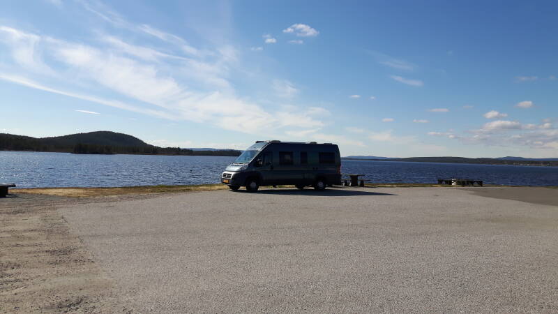 Vandaag de hele dag zon en een aangename temperatuur van rond de 15 graden. Eerst naar Umeå gereden en daar aan de rivier geluncht en vervolgens door gereden naar Nationaal Park  Skuleberget, waar we vervolgens op de camperplaats van Lövänger gestopt zijn. We zijn benieuwd of het vannacht nog donker wordt en wat de temperatuur zal zijn.