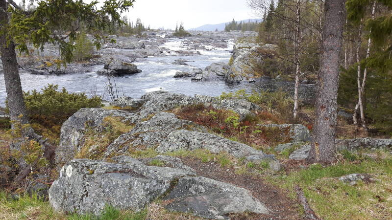 Bij het wakker worden lichte regen en bij vertrek wisselend zonnig en bewolkt, wel droog. Onderweg een lange pauze aan een meer om te douchen en alles te drogen. Nog even bij het openluchtmuseum in Strömsund gestopt en verder naar Svenstavik. Na de sani stop aldaar doorgereden tot kort bij Rätan en aan het riviertje, tevens einde meer gaan staan voor de overnachting. Na een korte wandeling klaar voor een rustige nacht.