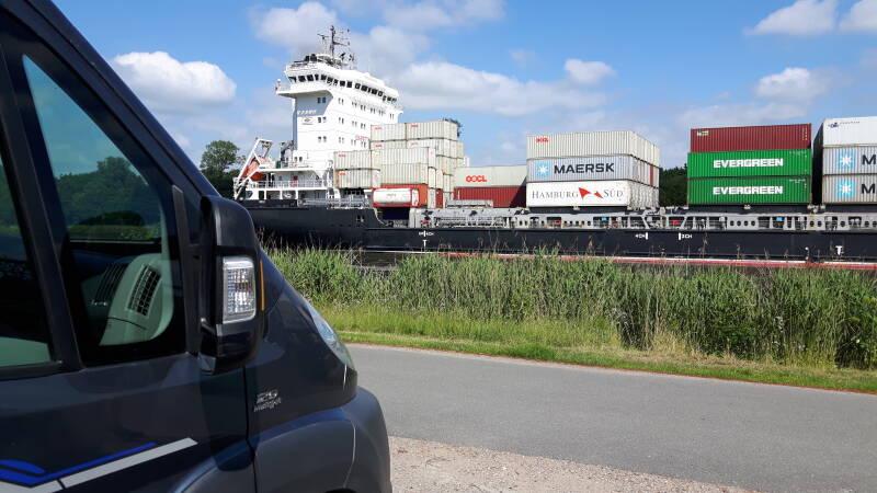 Alweer wakker geworden met prachtig weer en na ontbijt etc. vertrokken naar Møgeltønder om het kasteel (Landhuis) te bekijken. Voordat we daar waren, kregen we een lekke band en deze dus verwisseld. Dit kon ik doen op een oprit van een huis waar ze aardbeien verkochten, er is zelfs nog niemand komen kijken, laat staan helpen terwijl ze op 10 meter van onze camper klanten aan het helpen waren. Dus de behulpzaamheid van de betreffende Deen viel nogal tegen. Na het slot gezien te hebben ( op afstand), wij vonden het geen entreeprijs waard, zijn we  over leuke binnendoor weggetjes en langs de kust naar Hochdonn gereden. Dit is een prachtige camperplaats aan het kanaal van de Noordzee naar de Oostzee en geschikt voor kleine zeeboten, deze hebben we ook volop gezien. Vandaag de 28 graden bereikt.