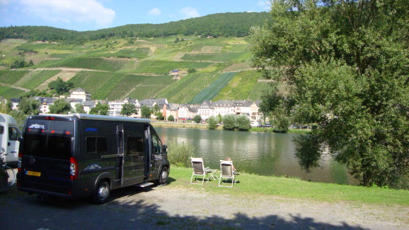 Een weekend uitrusten aan de Moezel. Heerlijk weer en een mooie omgeving, wat wil je nog meer? Lekker gewandeld en Zell bezichtigd, veel gerust en iets te lang in de zon gelegen. Vrijdag naar de Keltische belage in Kaimt (300 meter van onze camperplaats) geweest. Dit gaat over de Kelten (Kaimt) aan de ene kant van de Moezel en de Romeinen aan de andere kant (Zell). Na een harde strijd komt een verbroedering en deze wordt gevierd in de wijnkelders in Kaimt. Daar vloeit de wijn rijkelijk en het is ons niet gelukt om overal te proeven. Wel genoten van goed eten en drinken. Zaterdag naar Luc & Lia gereden in Meisburg (Tussen Daun en Bitburg) Daar kwamen Tom & Ilse ook op visite en na hard werken van de heren (2 aanhangers groen afval storten) en een fikse wandeling van de dames met de honden was het aangenaam vertoeven met zelf gedistilleerde Palenka en bier. 's-Avonds nog naar de (Kermis) lees drankgelag geweest, een paar honderd meter vanaf het huis van Luc & Lia. Daarna nog gezellig op eigen terras. Zondag terug naar huis na een aantal heerlijke dagen.